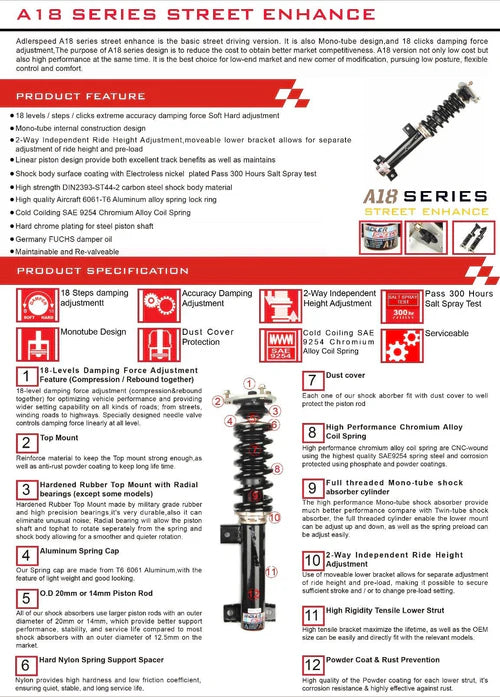 Adlerspeed A18 series street enhance is the basic street driving version. It is also Mono-tube design,and 18 clicks damping force adjustment,The purpose of A18 series design is to reduce the cost to obtain better market competitiveness. A18 version not only low cost but also high performance at the same time. It is the best choice for low-end market and new comer of modification, pursuing low posture, flexible control and comfort.