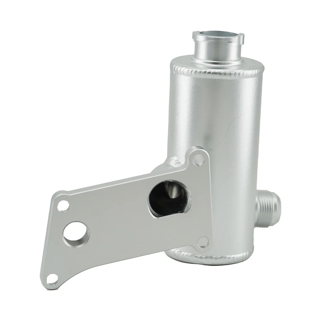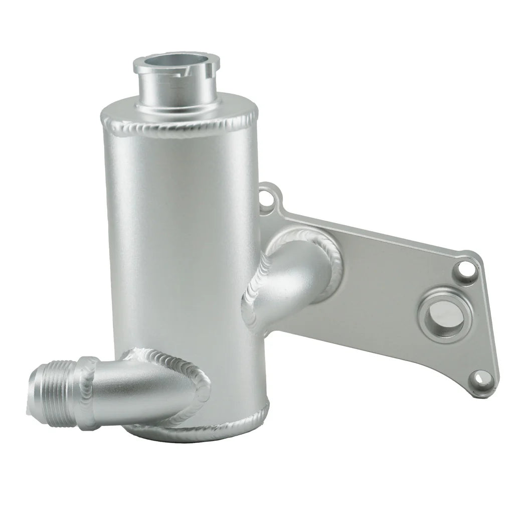 The V2 Swirl Pot is designed for RBC/RBB cylinder heads, offering improved clearance for sidewinder turbo manifolds and larger turbos. Its forward-mounted tank design optimizes fitment, making it ideal for compact engine bays.