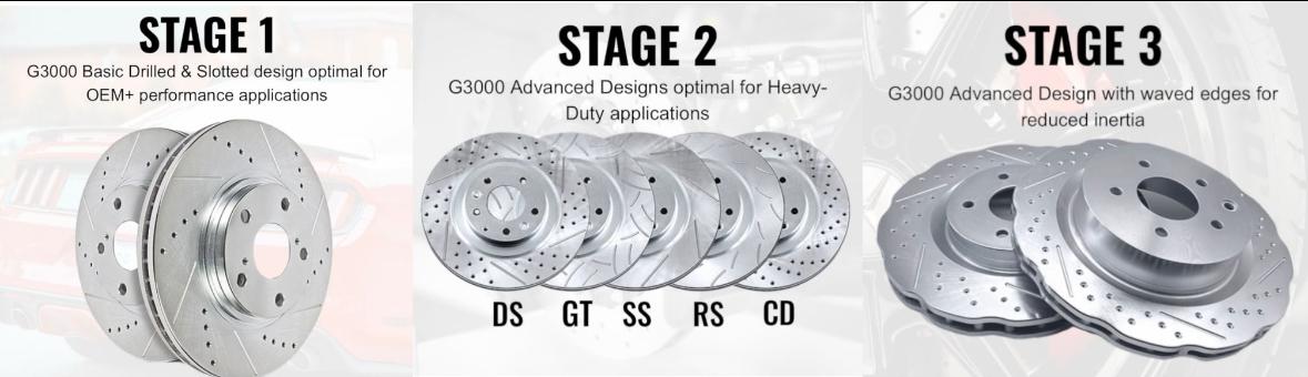 Heavy-Duty performance brake rotor set G3000 Carbon-Steel with harmonic balancing and anti-rust zinc plating. Drilled & Slotted rotors provide upgraded cooling, increased stopping power and reduced weight.